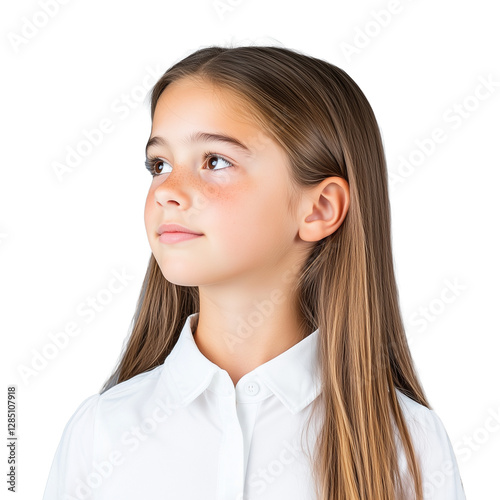 Young girl with long brown hair looking up with hopeful expression on transparent background