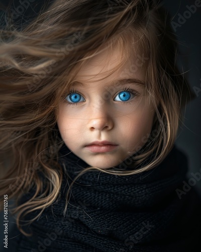 Young girl with striking blue eyes. Intense portrait of a young girl with vivid blue eyes and windswept hair, displaying innocence and curiosity