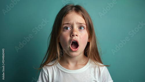 Young girl with surprised expression and open mouth. Child with widened eyes. Portrait of kid, blond hair. Facial expression of surprise, shock or amazement. Kids face with freckles.