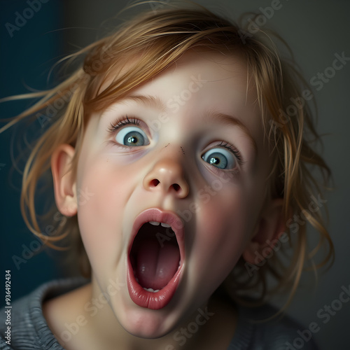 Young girl with wide eyes and open mouth expressing surprise or shock, close-up portrait