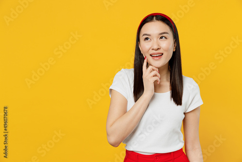 Young girl woman of Asian ethnicity 20s in white t-shirt put hand prop up on chin lost in thought and conjectures isolated on plain yellow background studio portrait. People emotions concept