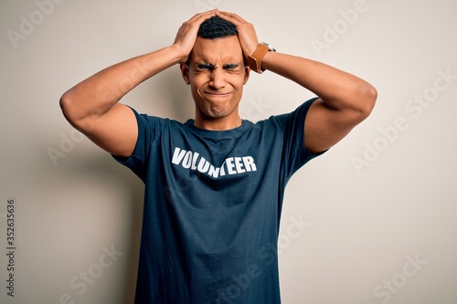 Young handsome african american man volunteering wearing t-shirt with volunteer message suffering from headache desperate and stressed because pain and migraine. Hands on head.