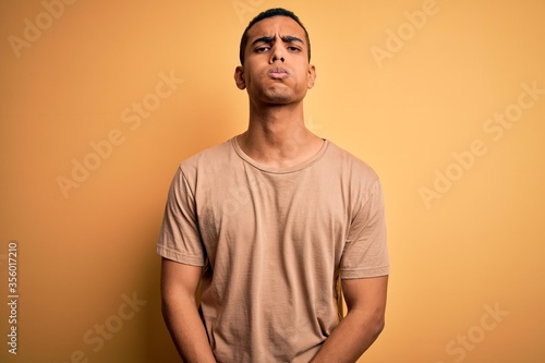 Young handsome african american man wearing casual t-shirt standing over yellow background puffing cheeks with funny face. Mouth inflated with air, crazy expression.