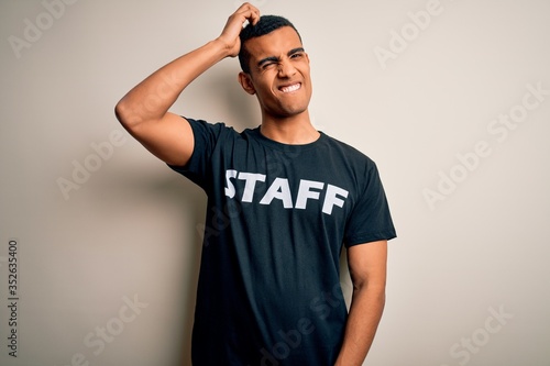 Young handsome african american worker man wearing staff uniform over white background confuse and wondering about question. Uncertain with doubt, thinking with hand on head. Pensive concept.