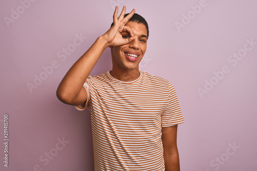 Young handsome arab man wearing striped t-shirt standing over isolated pink background doing ok gesture with hand smiling, eye looking through fingers with happy face.