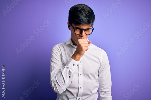 Young handsome business man wearing shirt and glasses over isolated purple background feeling unwell and coughing as symptom for cold or bronchitis. Health care concept.