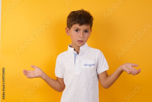 Young handsome Caucasian little boy standing against yellow wall looks uncertain shrugs shoulders.