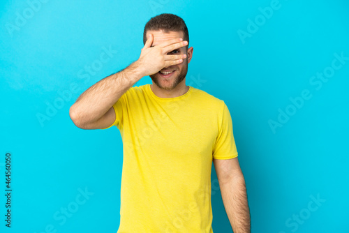 Young handsome caucasian man isolated on blue background covering eyes by hands and smiling