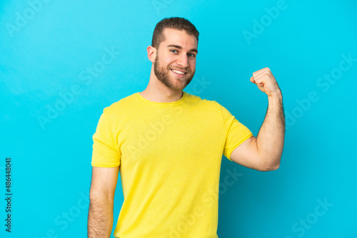 Young handsome caucasian man isolated on blue background doing strong gesture