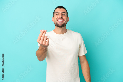 Young handsome caucasian man isolated on blue background making money gesture
