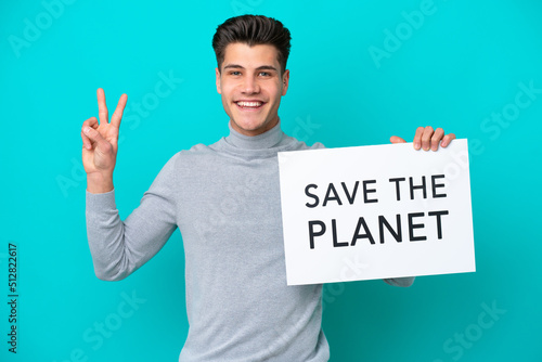 Young handsome caucasian man isolated on blue bakcground holding a placard with text Save the Planet and celebrating a victory