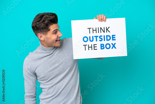Young handsome caucasian man isolated on blue bakcground holding a placard with text Think Outside The Box