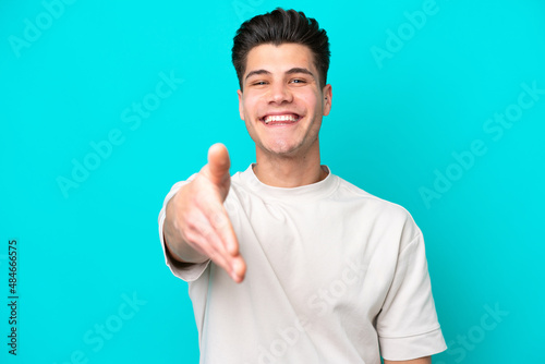 Young handsome caucasian man isolated on blue bakcground shaking hands for closing a good deal