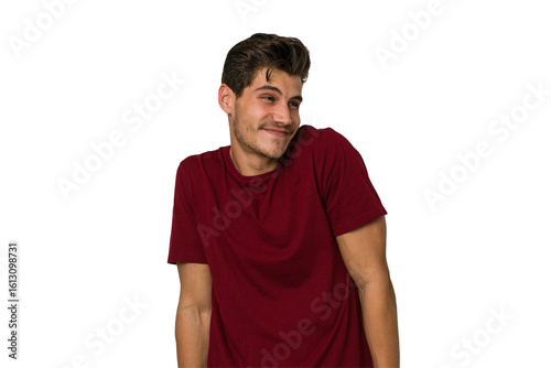 Young handsome caucasian man isolated on white background laughs and closes eyes, feels relaxed and happy.
