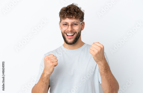 Young handsome caucasian man isolated on white background With glasses and celebrating a victory