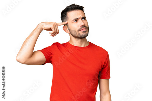 Young handsome caucasian man over isolated chroma key background making the gesture of madness putting finger on the head