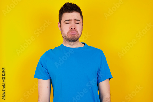 young handsome caucasian man wearing blue t-shirt against yellow background keeps teeth clenched, frowns face in dissatisfaction, irritated because of much duties.