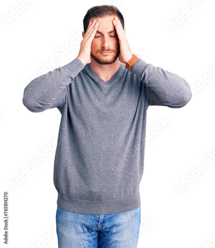 Young handsome caucasian man wearing casual winter sweater suffering from headache desperate and stressed because pain and migraine. hands on head.