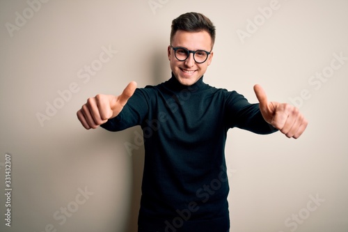 Young handsome caucasian man wearing glasses and casual sweater over isolated background approving doing positive gesture with hand, thumbs up smiling and happy for success. Winner gesture.