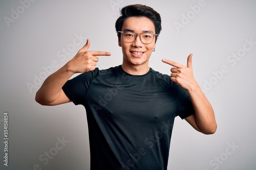 Young handsome chinese man wearing black t-shirt and glasses over white background smiling cheerful showing and pointing with fingers teeth and mouth. Dental health concept.