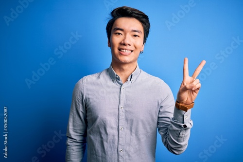 Young handsome chinese man wearing casual shirt standing over isolated blue background showing and pointing up with fingers number two while smiling confident and happy.