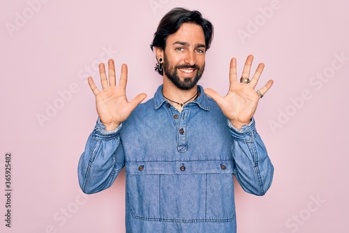 Young handsome hispanic bohemian man wearing hippie style over pink background showing and pointing up with fingers number ten while smiling confident and happy.