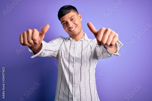 Young handsome hispanic man wearing elegant business shirt standing over purple background approving doing positive gesture with hand, thumbs up smiling and happy for success. Winner gesture.