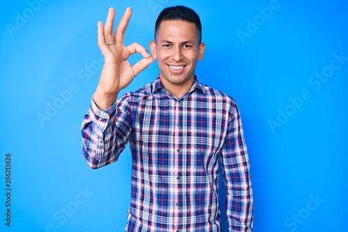 Young handsome latin man wearing casual clothes smiling positive doing ok sign with hand and fingers. successful expression.