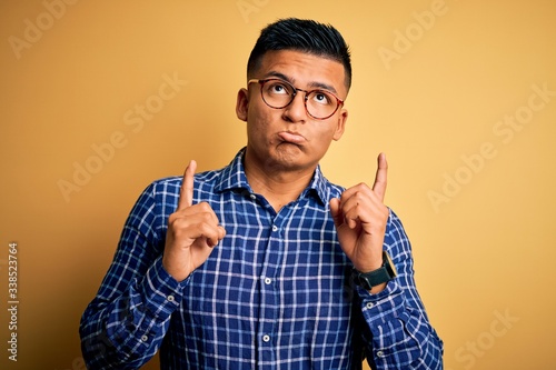 Young handsome latin man wearing casual shirt and glasses over yellow background Pointing up looking sad and upset, indicating direction with fingers, unhappy and depressed.