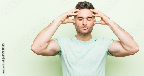 Young handsome man against a green background touching temples and having headache.
