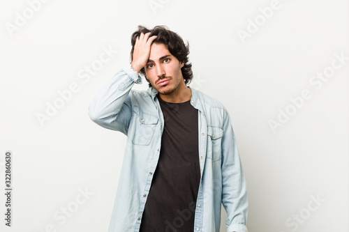 Young handsome man against a white background tired and very sleepy keeping hand on head.