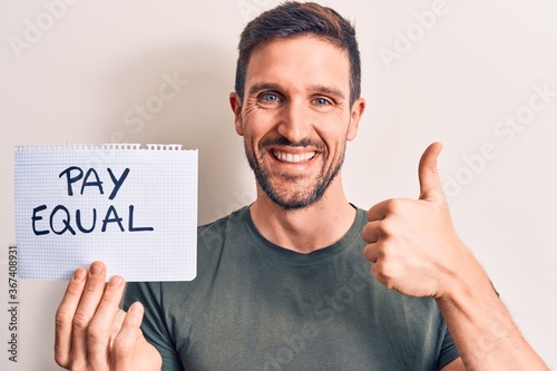 Young handsome man asking for equality economy holding paper with pay equal message smiling happy and positive, thumb up doing excellent and approval sign