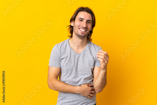 Young handsome man isolated on yellow background laughing