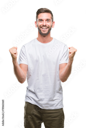 Young handsome man over isolated background celebrating surprised and amazed for success with arms raised and open eyes. Winner concept.