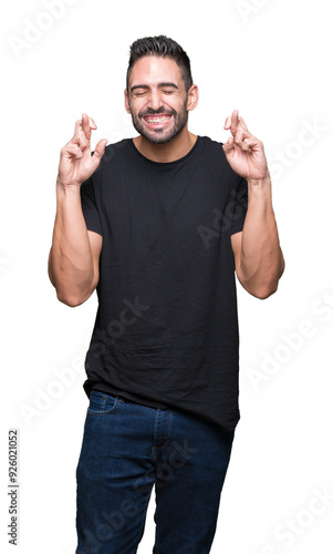Young handsome man over isolated background smiling crossing fingers with hope and eyes closed. Luck and superstitious concept.