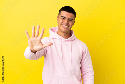 Young handsome man over isolated yellow background counting five with fingers