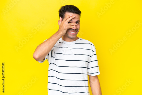 Young handsome man over isolated yellow background covering eyes by hands and smiling