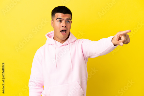 Young handsome man over isolated yellow background pointing away
