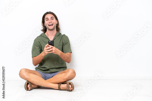 Young handsome man sitting on the floor isolated on white background surprised and sending a message