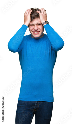 Young handsome man wearing blue sweater over isolated background suffering from headache desperate and stressed because pain and migraine. Hands on head.