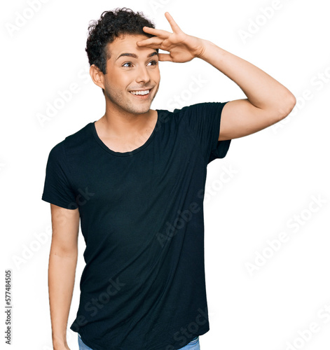Young handsome man wearing casual black t shirt very happy and smiling looking far away with hand over head. searching concept.