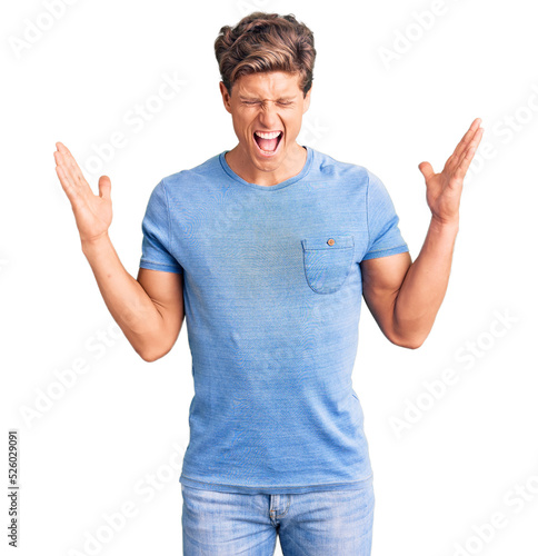 Young handsome man wearing casual clothes celebrating mad and crazy for success with arms raised and closed eyes screaming excited. winner concept