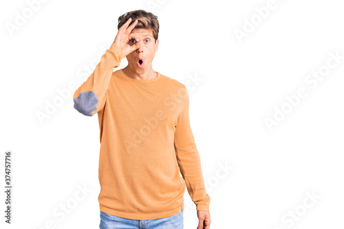 Young handsome man wearing casual clothes doing ok gesture shocked with surprised face, eye looking through fingers. unbelieving expression.