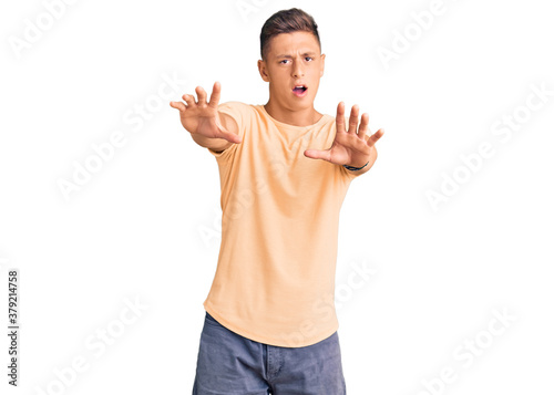 Young handsome man wearing casual clothes doing stop gesture with hands palms, angry and frustration expression