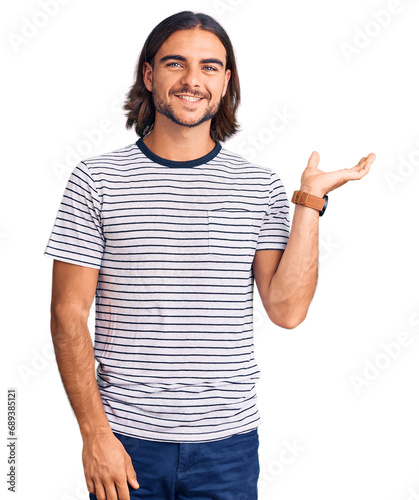 Young handsome man wearing casual clothes smiling cheerful presenting and pointing with palm of hand looking at the camera.