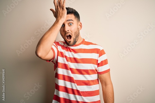 Young handsome man wearing casual striped t-shirt standing over isolated white background surprised with hand on head for mistake, remember error. Forgot, bad memory concept.