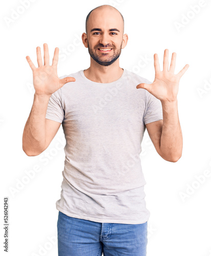 Young handsome man wearing casual t shirt showing and pointing up with fingers number ten while smiling confident and happy.