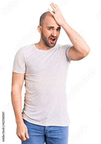 Young handsome man wearing casual t shirt surprised with hand on head for mistake, remember error. forgot, bad memory concept.