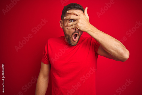Young handsome man wearing casual t-shirt over red isolated background peeking in shock covering face and eyes with hand, looking through fingers with embarrassed expression.