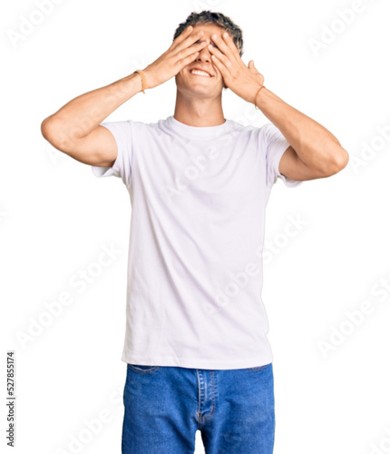 Young handsome man wearing casual white tshirt covering eyes with hands smiling cheerful and funny. blind concept.
